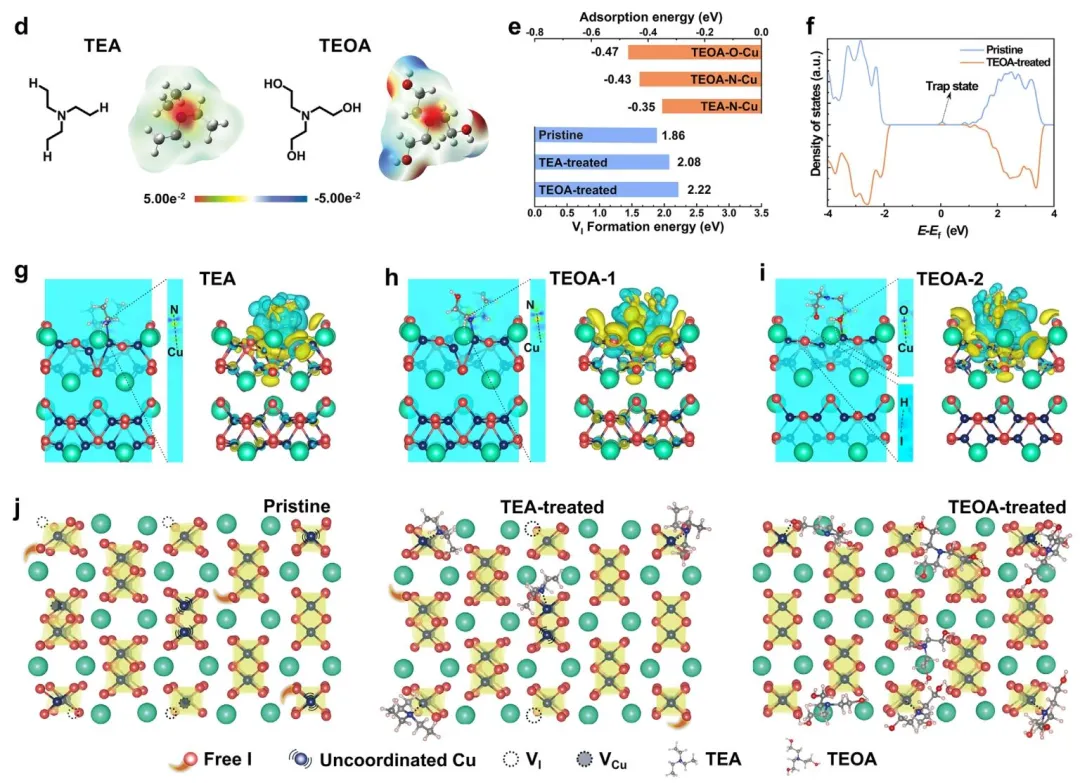 图1、CsCu₂I₃晶体学缺陷示意图,包括(a)I_int和Cu_int,(b)Cu_I和I_Cu,(c)V_I和V_Cu及其相应的形成能;(d)TEA和TEOA的模拟ESP分布图;(e)原始、TEA和TEOA修饰的CsCu₂I₃的E_ads(上)和V_I缺陷形成能(下)比较;(f)有缺陷和TEOA钝化的CsCu₂I₃的DOS光谱;(g)TEA和(h,i)TEOA在CsCu₂I₃界面上的稳定结构模型(左)和电荷重新分布(右);(j)原始CsCu₂I₃中有Cu或I相关缺陷的缺陷分布示意图,以及通过TEA或TEOA相互作用和修饰的CsCu₂I₃的内外钝化和稳定示意图。
