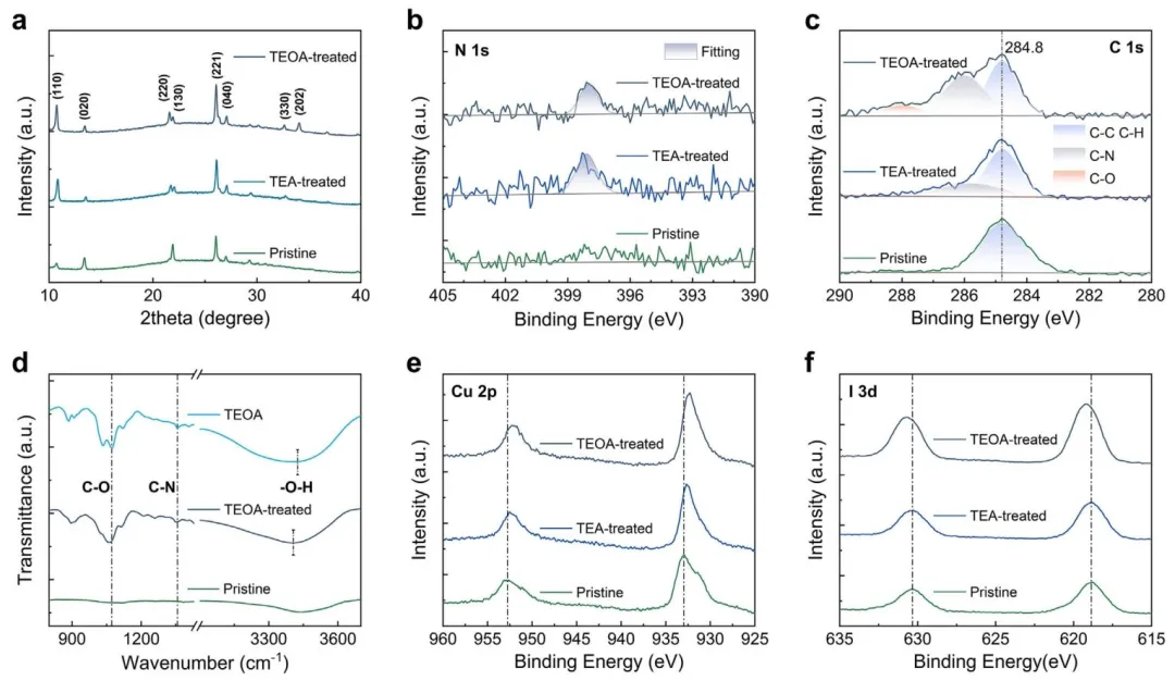 图2、(a)原始CsCu₂I₃薄膜、TEA和TEOA处理的CsCu₂I₃薄膜的XRD图谱;高分辨率XPS光谱:(b)N1s,(c)C1s,(e)Cu2p和(f)I3d;(d)TEOA分子、原始和TEOA处理的CsCu₂I₃薄膜的FTIR光谱。