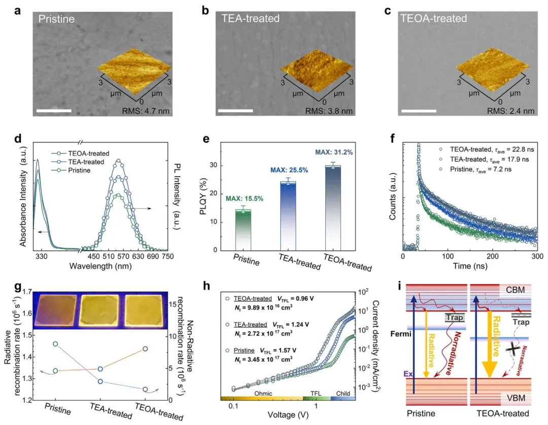 图3、(a–c)不同制备条件下CsCu₂I₃薄膜的顶视SEM图像,比例尺为500 nm;(d)不同条件下制备的CsCu₂I₃薄膜的UV-vis吸收和PL光谱;(e)统计PLQY;(f)时间分辨PL衰减;(g)非辐射和辐射复合速率;(h)SCLC测量;(i)TEOA钝化增强CsCu₂I₃薄膜荧光的示意图。