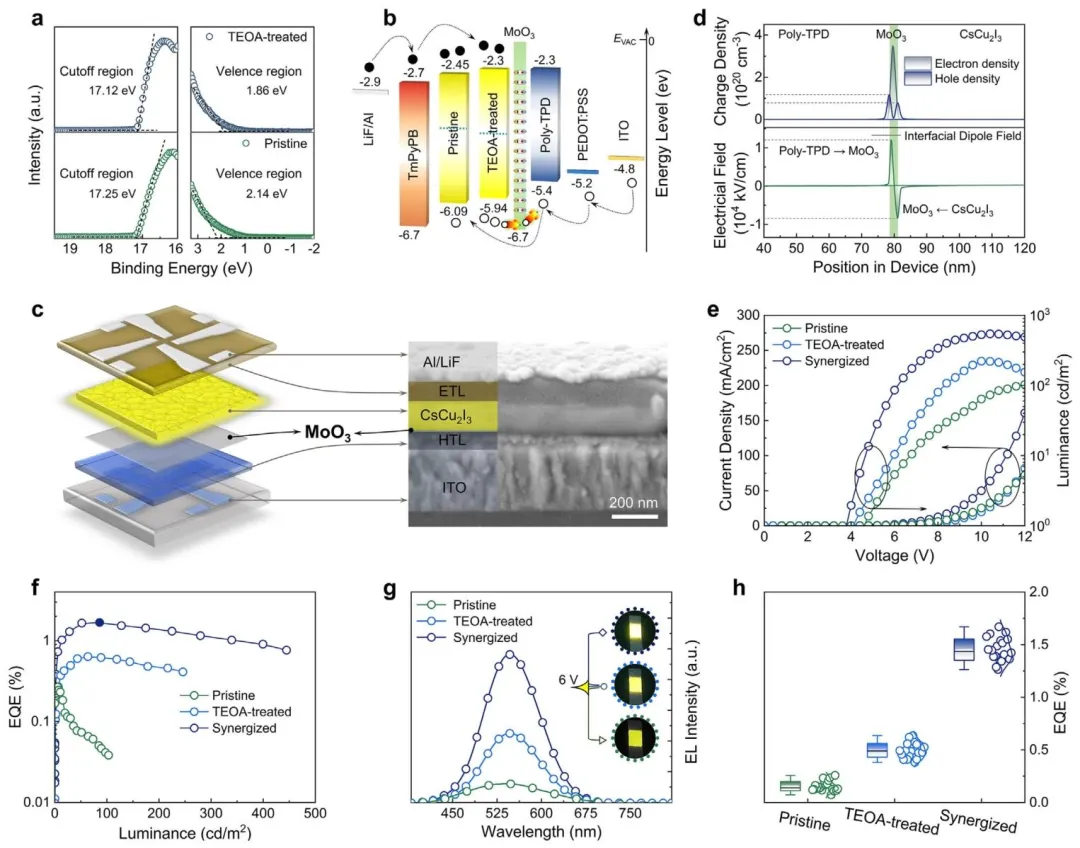 图4、(a)原始和TEOA处理的CsCu₂I₃薄膜的UPS光谱;(b)异质结构器件的能级图;(c)器件结构和CsCu₂I₃基LED的横截面SEM图像;(d)有MoO₃偶极层器件中的电荷密度和电场分布;(e)两个LED的电流密度和亮度随电压的变化;(f)EQE随亮度的变化;(g)两个器件在6.0V下的EL光谱;(h)二十个器件的EQE统计分布图。
