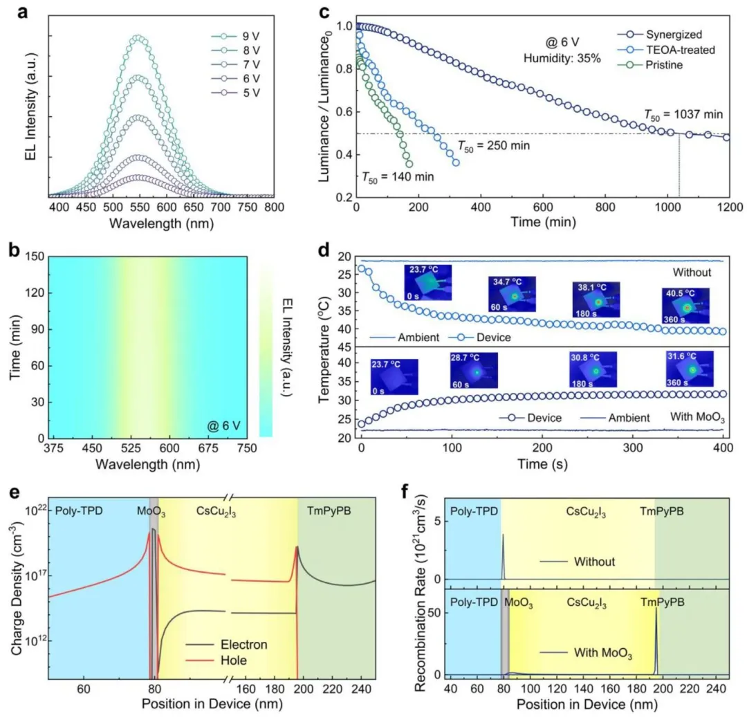 图5、(a)不同偏置电压下器件的EL光谱;(b)6V下器件EL光谱随150分钟的变化;(c)两个器件在相同测试条件下的操作寿命测量;(d)两个器件在100 cd/m²下连续运行时的表面温度分布;(e)器件中的电子和空穴分布;(f)两个器件的载流子复合速率分布。Scheme 1、CsCu₂I₃基LED的制备流程图。
