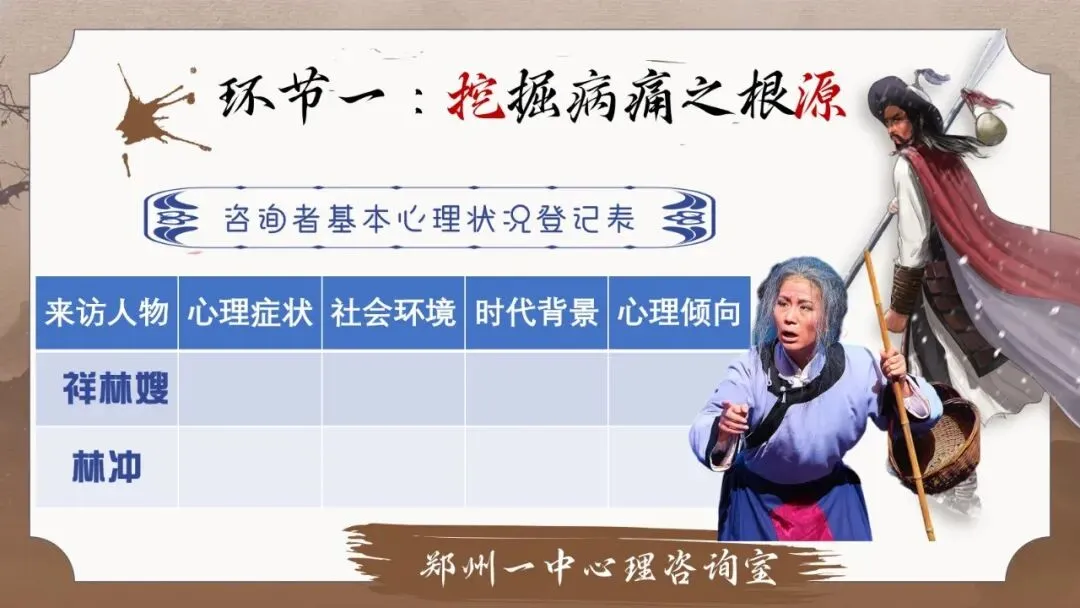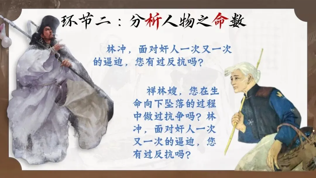 【创设情境】心理老师曾经告诉我们,倾听是心理治疗的最佳手段。面对祥林嫂和林冲,我们不妨多给他们一些陈词的机会,我们可以设计这样的问题让他们回答:祥林嫂,您在生命向下坠落的过程中做过抗争吗?林冲,面对奸人一次又一次的逼迫,您有过反抗吗?