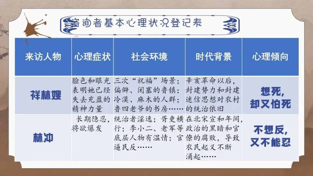①朗读文本,圈点勾画出主要情节,查找祥林嫂和林冲的反抗行为,并分析行为背后的心理动机。