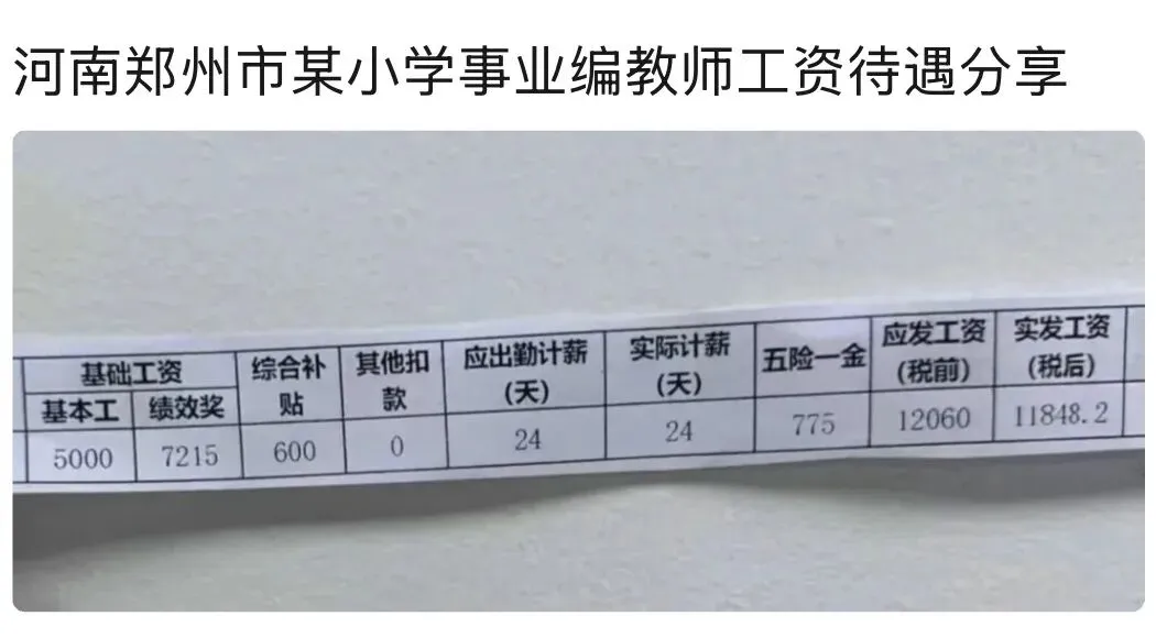 家人们,今天刷到一张郑州某小学事业编老师的工资条,看完我直接原地愣住了!先给你们扒一扒这张“凡尔赛”工资单👇• 基本工资:5000元• 绩效奖:7215元• 综合补贴:600元• 五险一金:775元• 应发工资(税前):12060元• 实发工资(税后):11848.2元这还只是一个小学老师的月收入?!🔥 看完工资单,我破防了在郑州,一个普通打工人月薪过万已经算不错了,而这位老师的税后收入直接破万,还不算寒暑假带薪、各种节日福利和隐形优势。