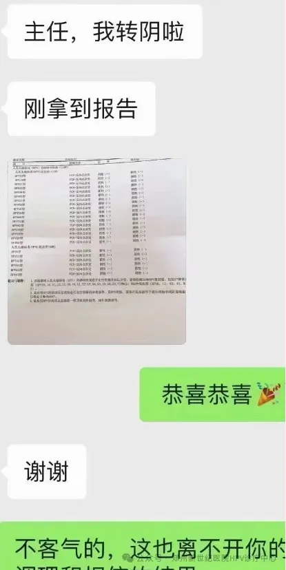 在我院,她接受了针对性中西结合病毒治疗,同时强化自身免疫以辅助清除病毒。经过这一系列精心治疗,当她再次踏上复查之路时,结果令人振奋——HPV35、66、16型均已实现转阴!这份突如其来的喜讯让她激动不已,她迫不及待地与我们分享了这份来之不易的快乐。