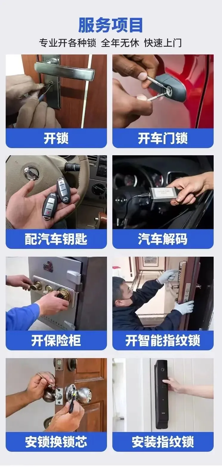 为什么选择我们?✅ 专业技术:多年开锁经验,解决各类复杂锁具问题。✅ 快速响应:全天候24小时服务,最快30分钟到达现场。✅ 无损开锁:采用先进设备,确保不损坏锁具。✅ 透明收费:合理透明的收费标准,无任何隐性费用。