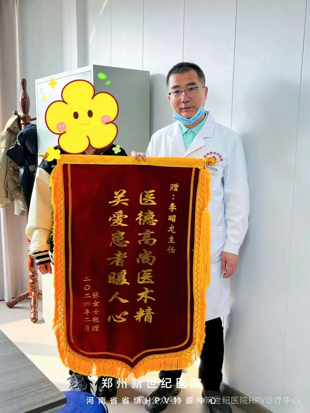 2023年2月27日,一名在院治疗康复患者怀着激动的心情将印有"医德高尚医术精 关爱患者暖人心"的一面锦旗送到了郑州新世纪医院【省HPV特诊中心】李主任手中。