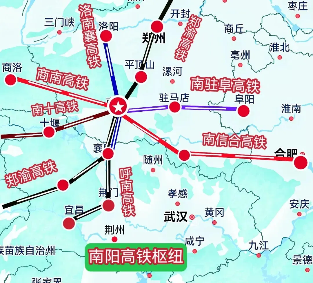 而南阳一旦将南信合高铁、南十高铁、南驻阜高铁和洛南襄高铁都建成通车,南阳将成为河南省第二个“米字形”高铁枢纽。