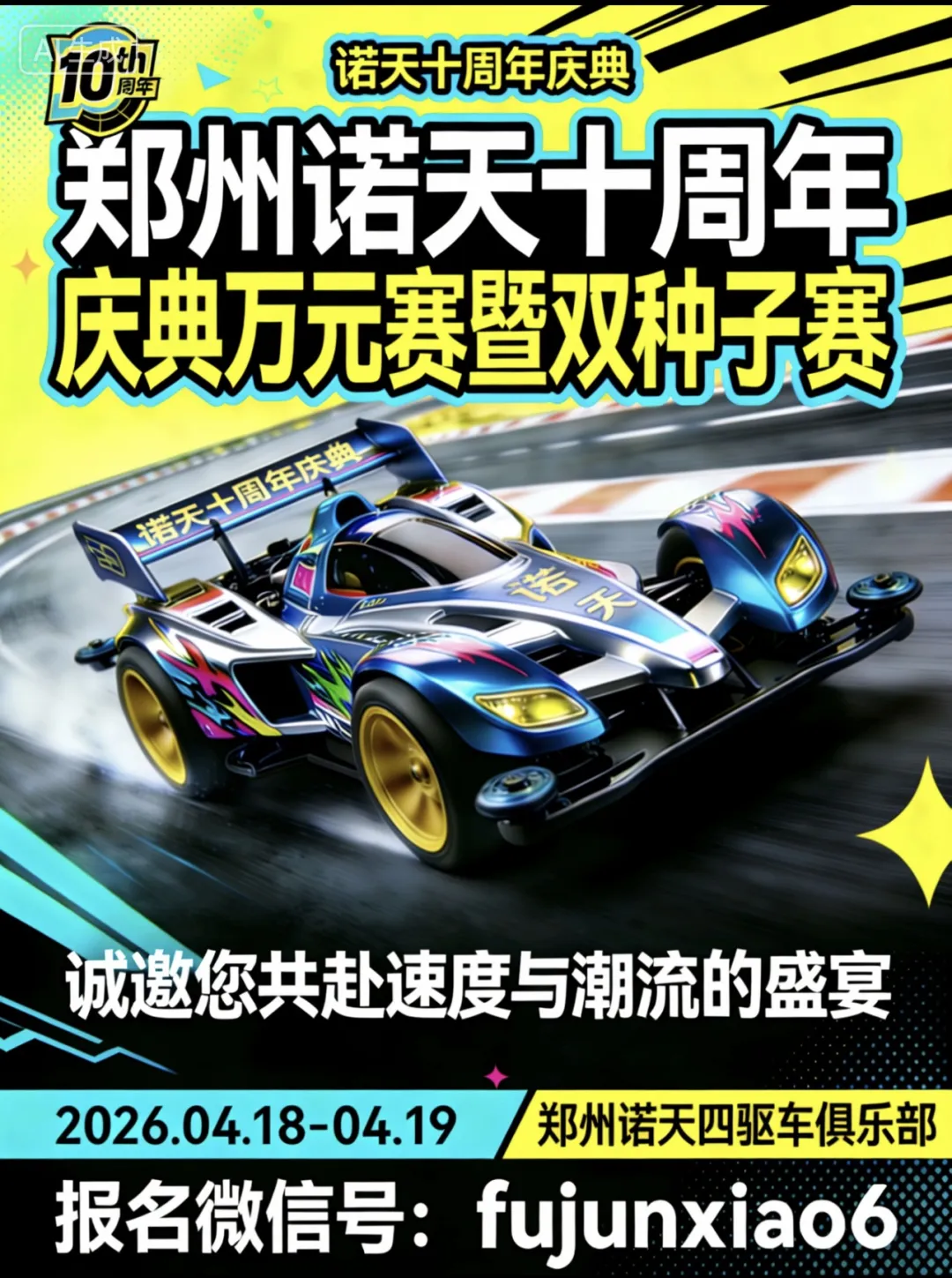 郑州诺天即将迎来十周年荣耀庆典,以迷你四驱车为纽带,打造一场竞速盛宴,现正式向全国四驱车爱好者发出诚挚邀约!