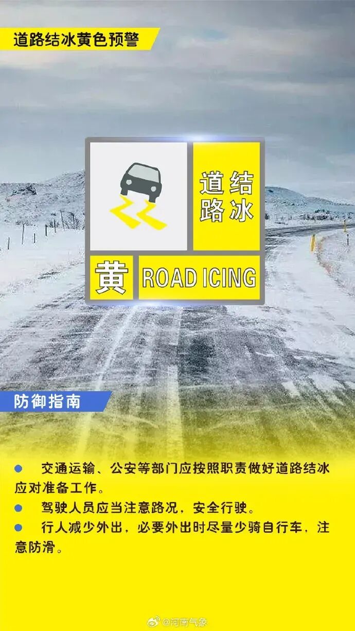 郑州市气象台2026年03月01日16时10分发布道路结冰黄色预警信号:受雨雪和低温影响,预计未来24小时内,郑州市主城区、航空港区、上街区所辖乡镇及街道路表温度在0℃左右,将出现对交通有较大影响的道路结冰,请注意防范。