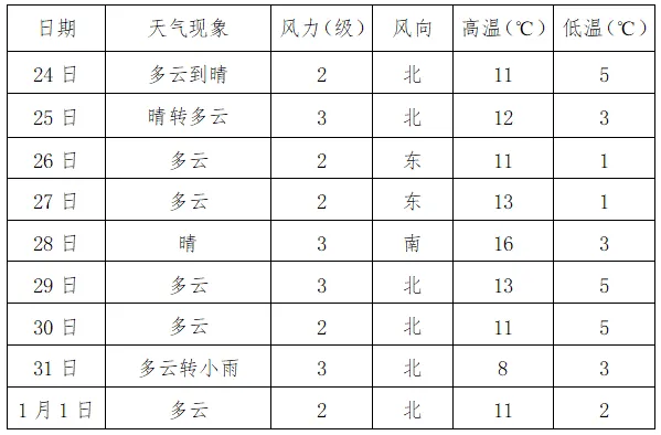 今天,我市多云到晴。12月31日多云转小雨,其余时段大部地区以晴到多云天气为主,12月27、28日和1月1日早晨局地可能有雾;气温波动起伏,大部高温8~16℃,低温1~5℃。