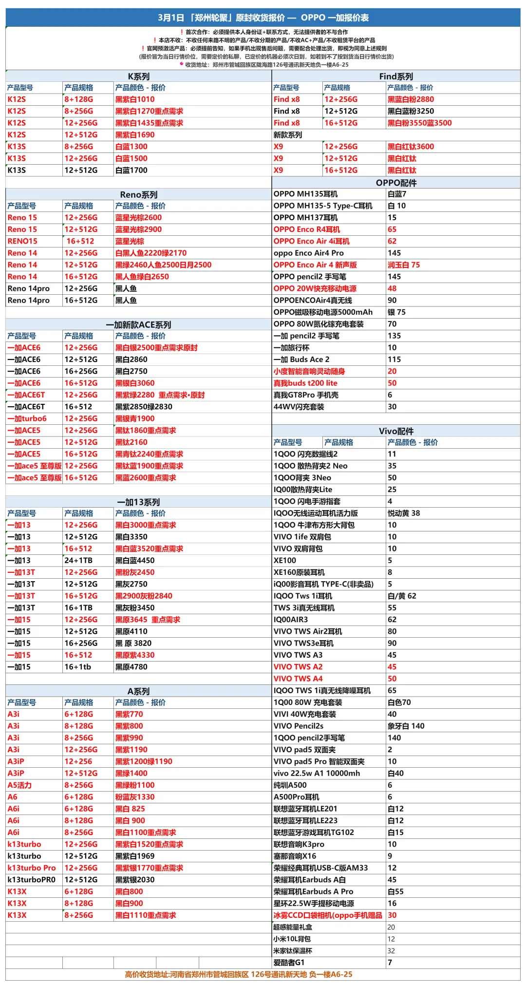 >郑州轮聚通讯 2026年3.1日数码报价更新