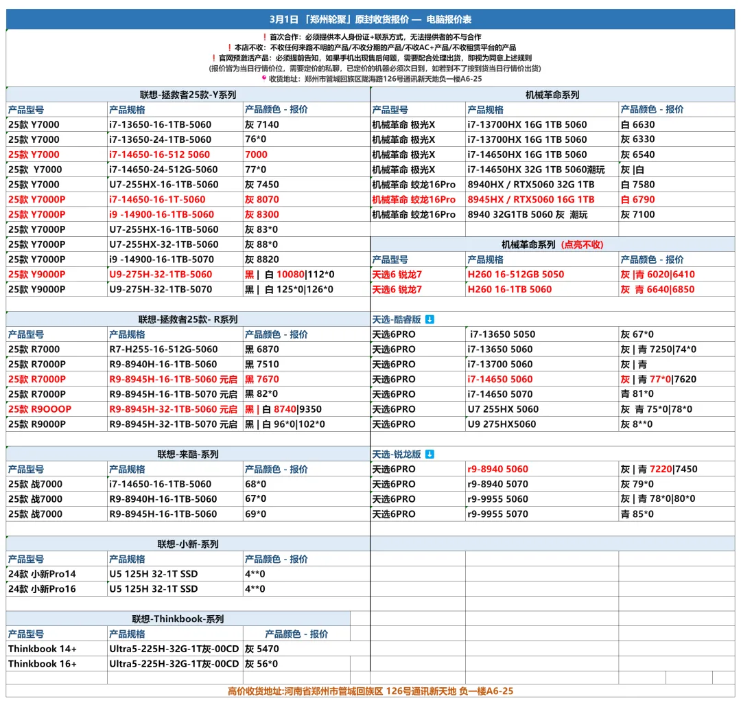 郑州轮聚通讯 2026年3.1日数码报价更新