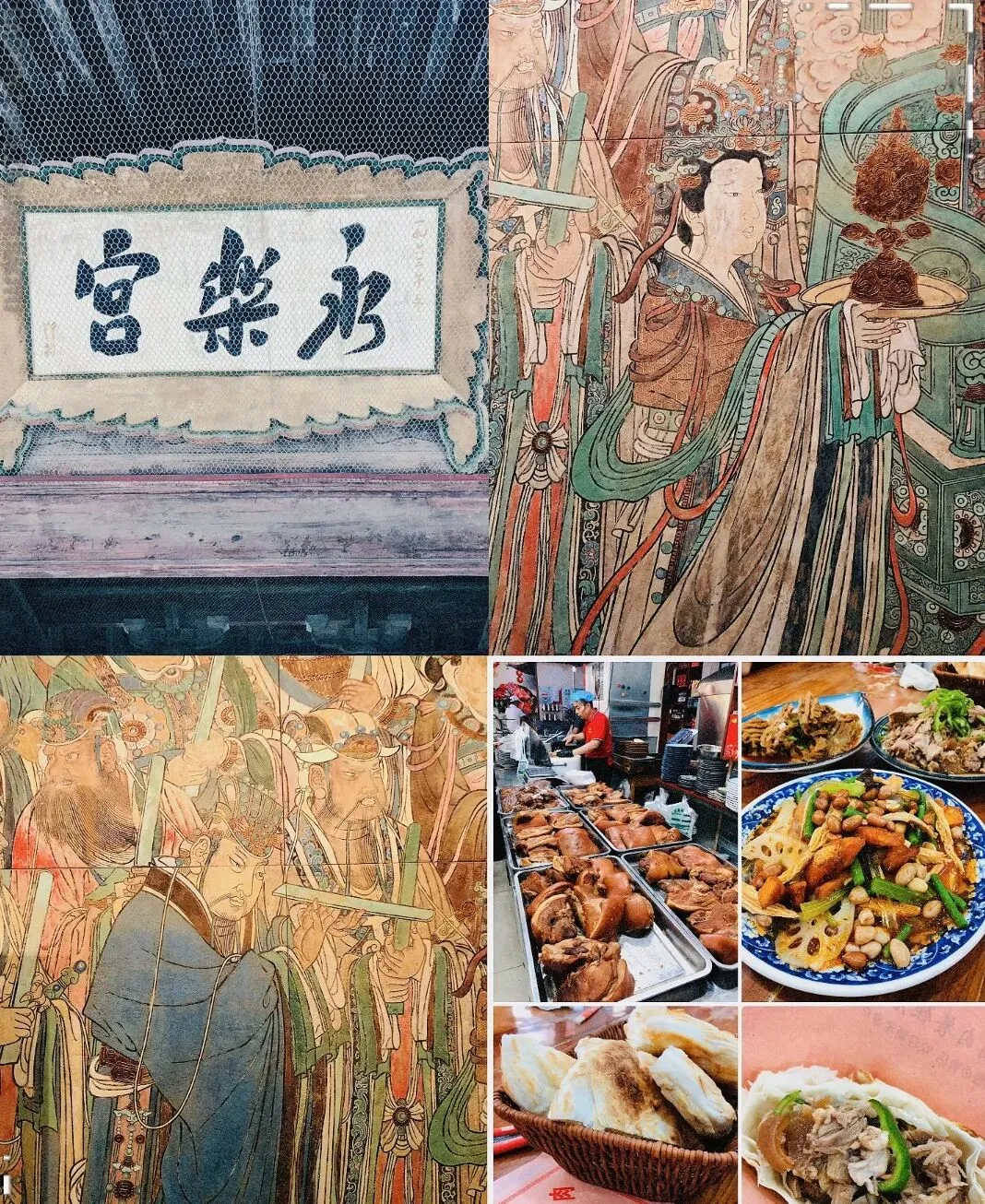 这次旅行里,去探访那些穿越时空的古迹,真的把我震撼到了。在永乐宫的无极殿(也就是三清殿)里,借着电筒光,我近距离看了《朝元图》壁画。七百多年前的艺术杰作就活生生在眼前,快三百平米的壁画上,快三百位神仙衣袂飘飘的,那色泽、那线条,一下子就让人感觉到艺术的永恒,还有咱人类的渺小。在广仁王庙,这可是中国仅存的唐代木结构建筑之一哦,我在屋檐下躲初春的小雨,就那么发了一下午呆。想着1100年前唐朝的工匠听到的也是这雨声,这种跨越时空的共鸣,成了我这趟旅行最棒的时刻。