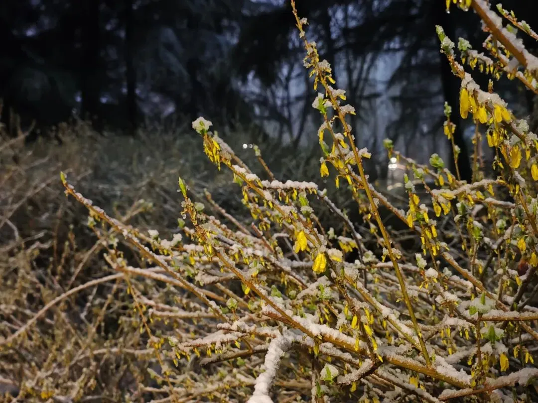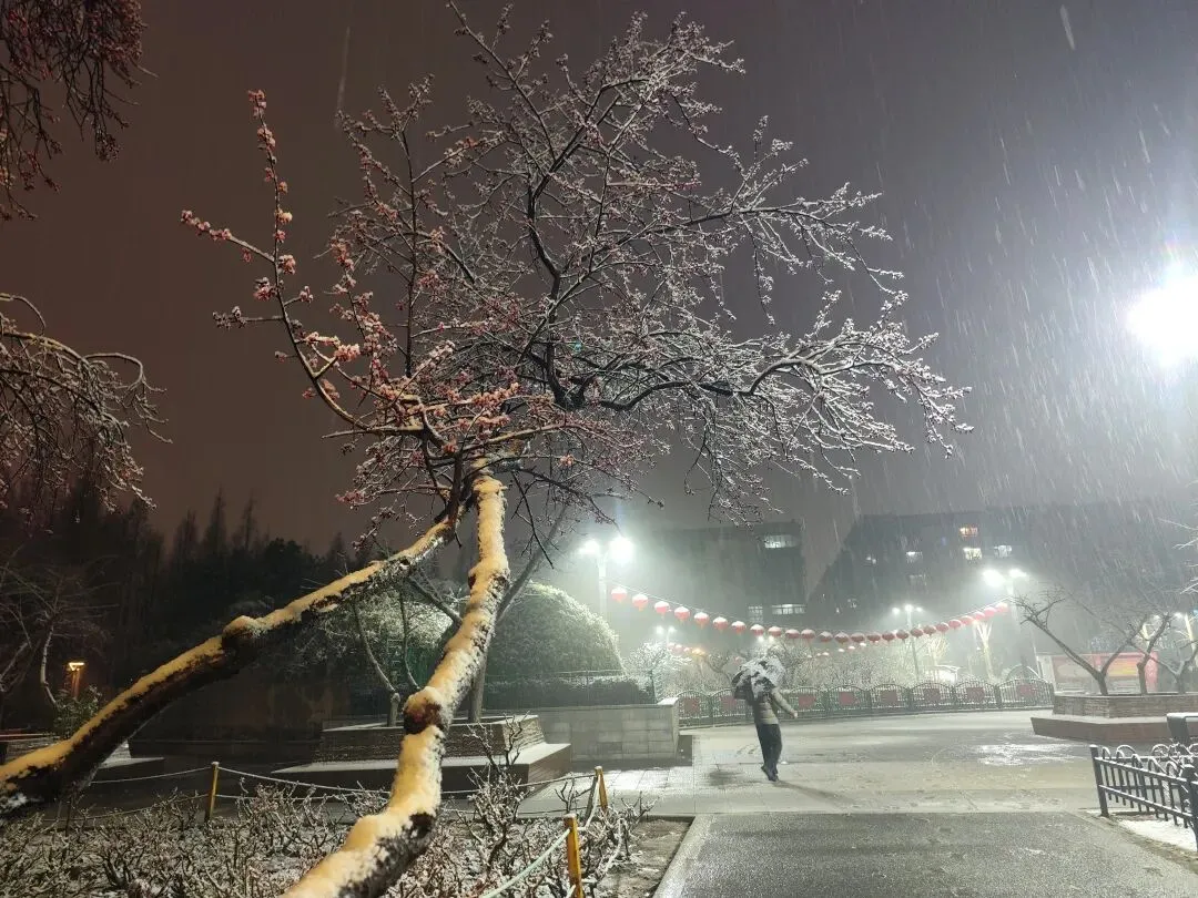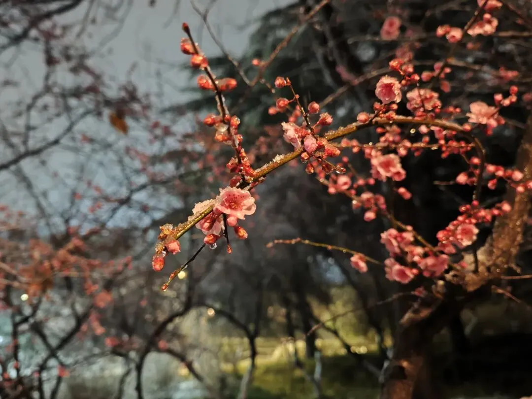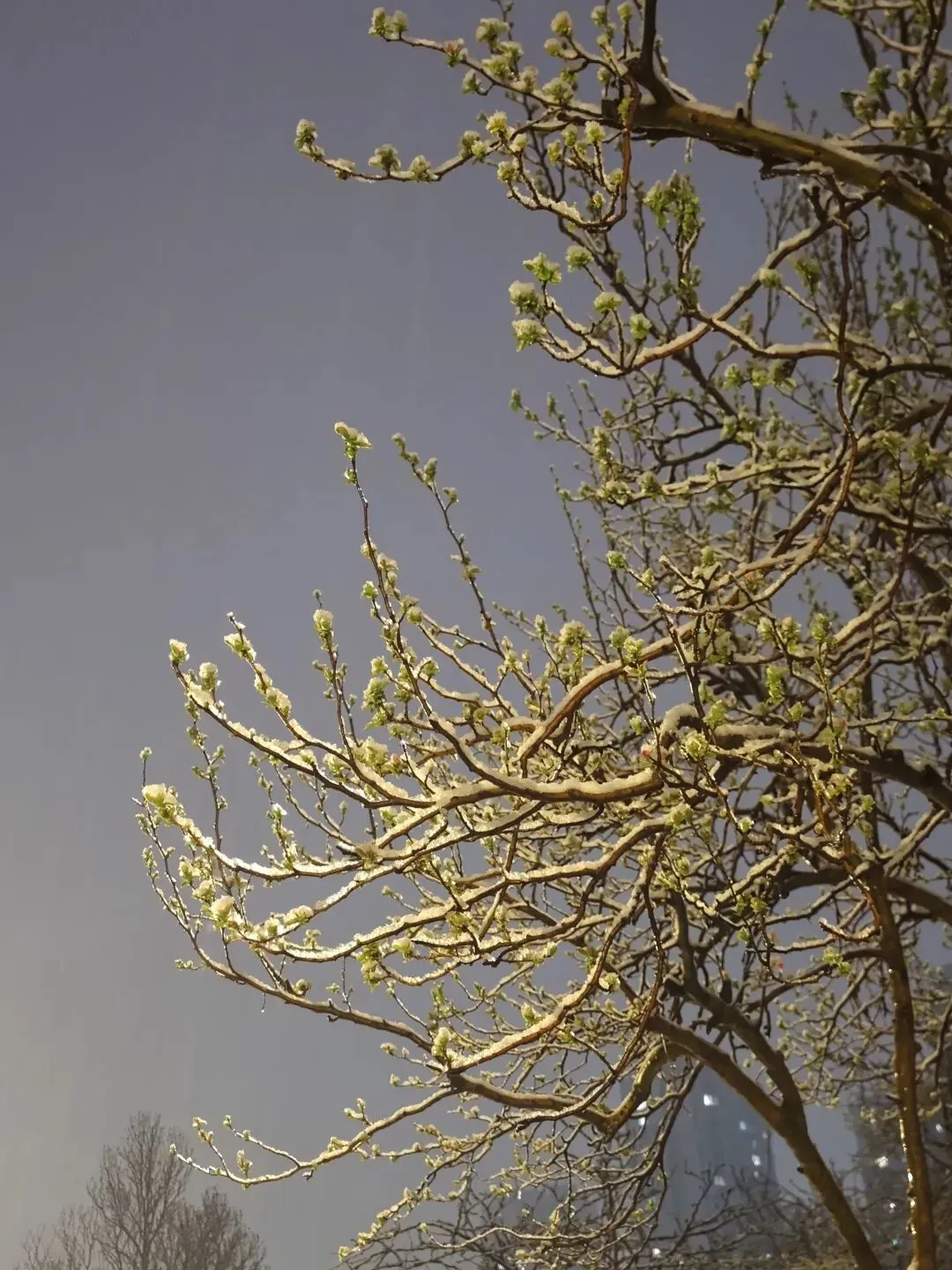 春雪降临,雪水与满树的蓓蕾凝珠,灯光下晶莹剔透。
