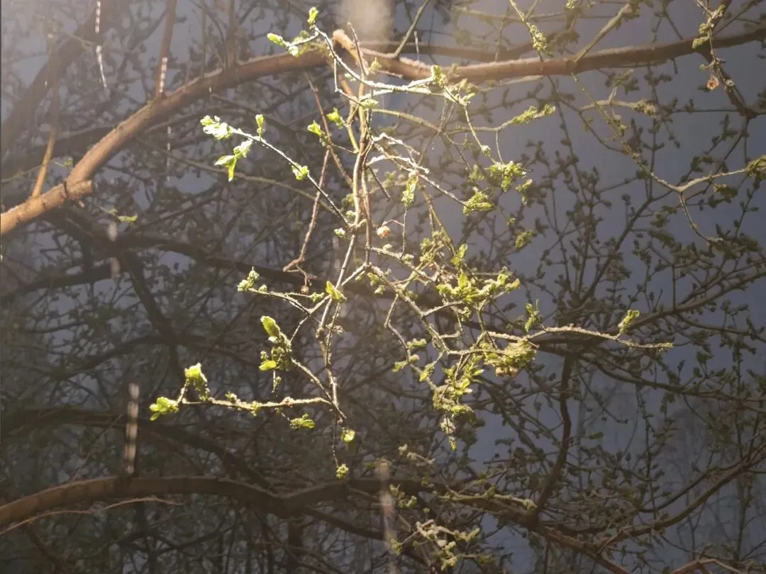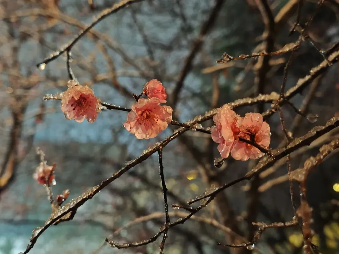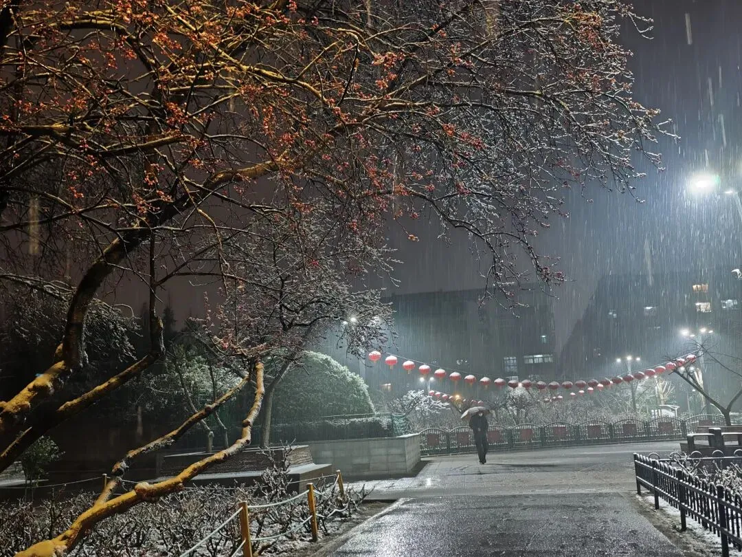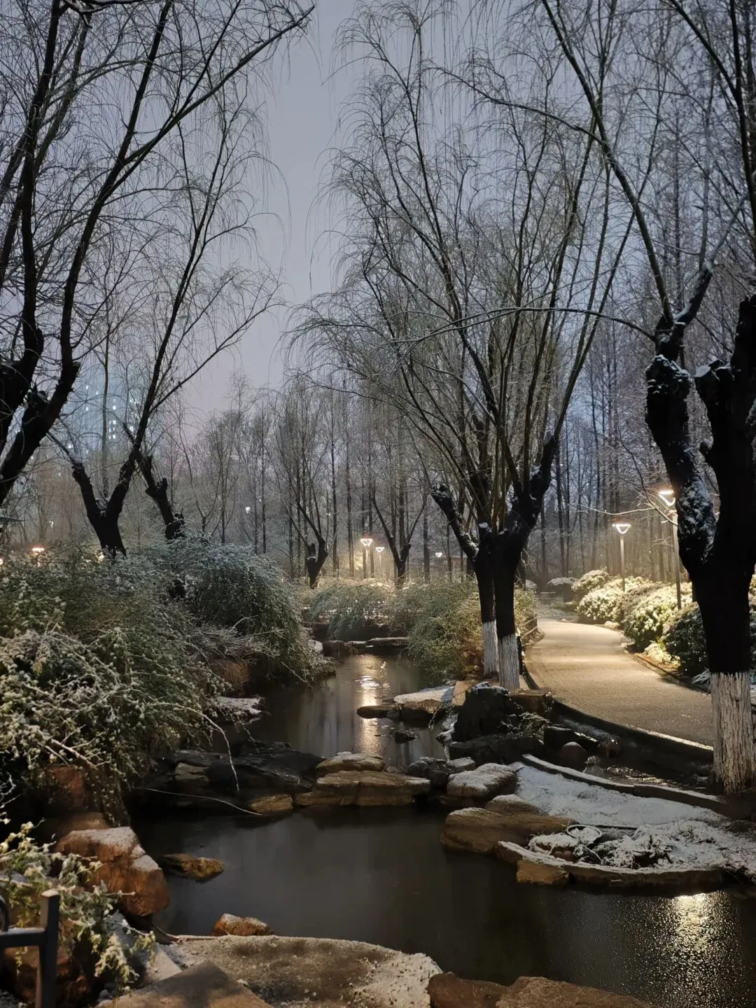春雪降临,雪水与满树的蓓蕾凝珠,灯光下晶莹剔透。