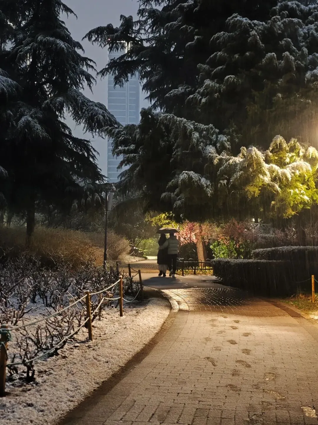这里是郑州月季公园,偶有市民在飞舞的春雪中偎依前行,浪漫十足。