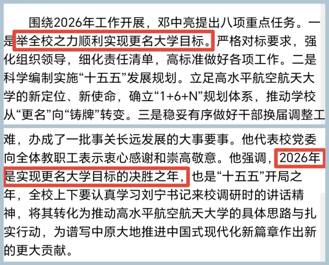 其中,包括“全校锚定更名大学目标”、“举全校之力顺利实现更名大学目标”、“2026年是实现更名大学目标的决胜之年”等等,最具价值的是“决胜之年”。