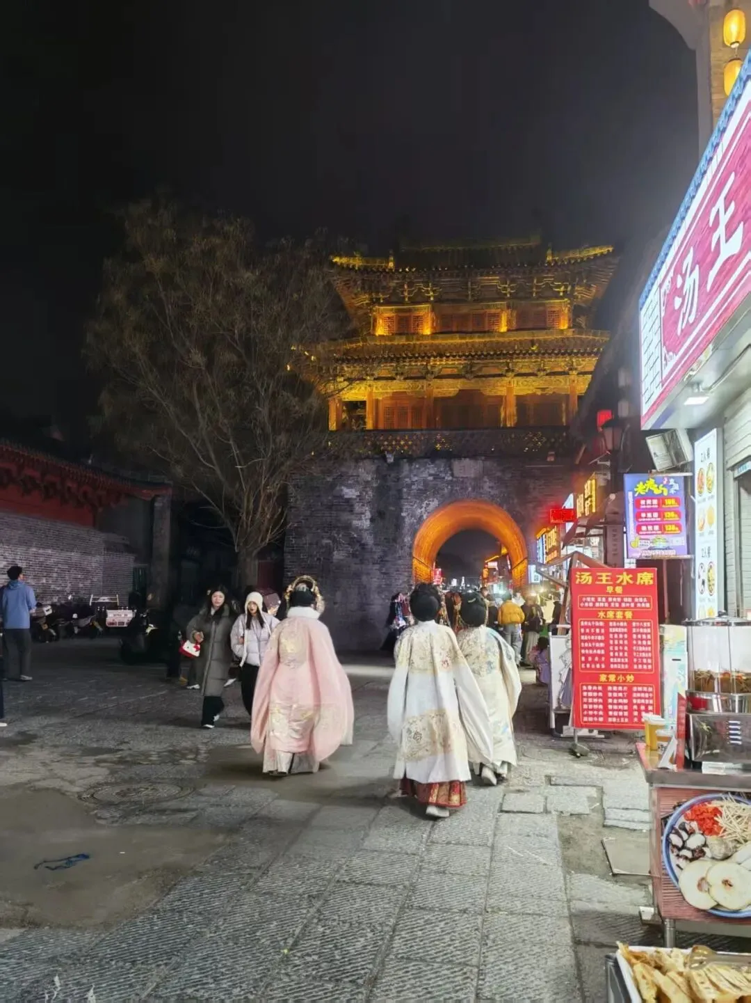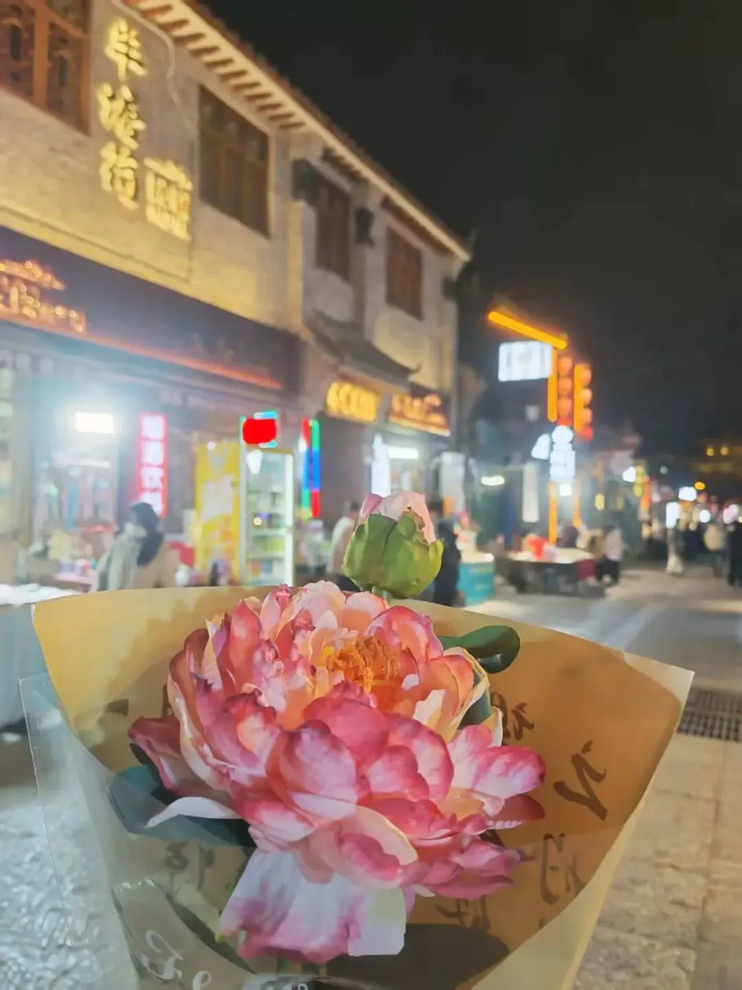 酒店入住完,就去了洛邑古城,这个景点是免票的哦!现场约就可以,店面屋顶都有很好看的彩灯。穿着汉服的小姐姐在景区里拍照,买了一枝牡丹花,兜售的小贩都会跟你讲,一支够用,买多了浪费。去时候的司机推荐我们去了一家吃水席的老店,店面不大,五个菜100块钱,巨好吃!景区里还有1块钱两个的水煎包,果然河南人有自己的物价。返程的司机跟我们讲第二天如果去白马寺再到龙门石窟,景点饭不好吃,可以去三旦羊肉汤味道还行,吃完了走过去就可以,嗯第一句记住了,吃完了走过去这句话忘记了。热情亲切的就像邻居家的哥哥姐姐。