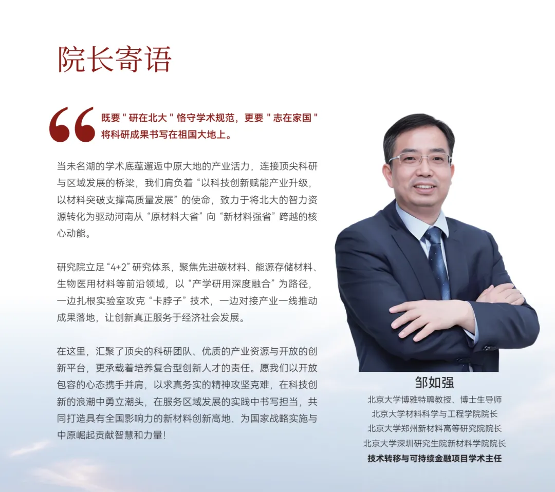 “以科学促工程,以材料创未来”。2024年,北京大学郑州新材料高等研究院揭牌成立。从北京未名湖畔到郑州北龙湖畔,北京大学材料科学与工程学院科研团队将为河南科技创新和产业发展注入强劲动能。
