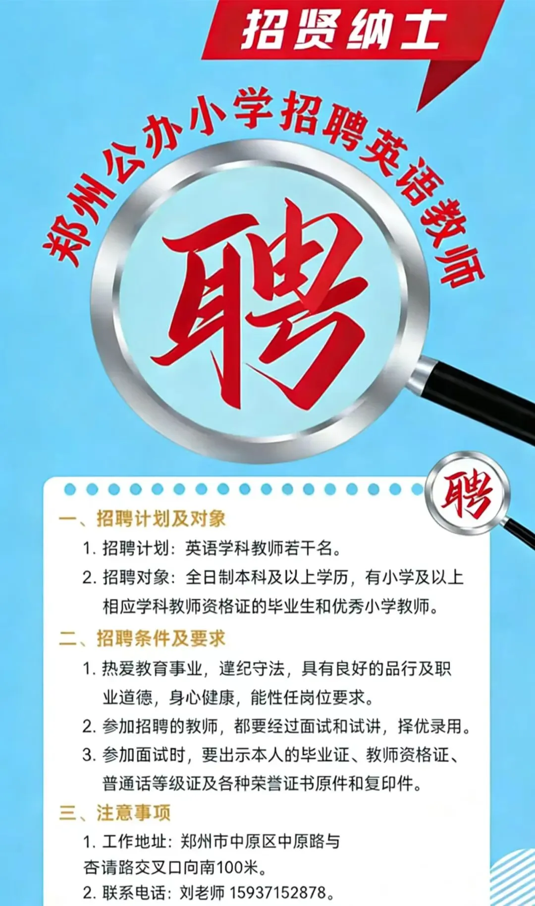 郑州市中原区公办小学,招聘英语老师若干,如有意向可联系:15937152878