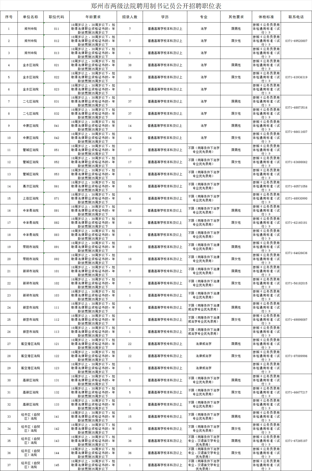 附件:郑州市两级法院聘用制书记员公开招聘职位表