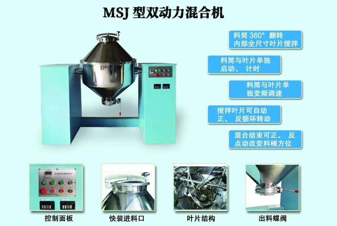 双动力混合机混合原理:料桶360°翻转运动加内部全尺寸搅拌叶片强制剪切、搅拌物料,使物料混合更加均匀,且效率高。