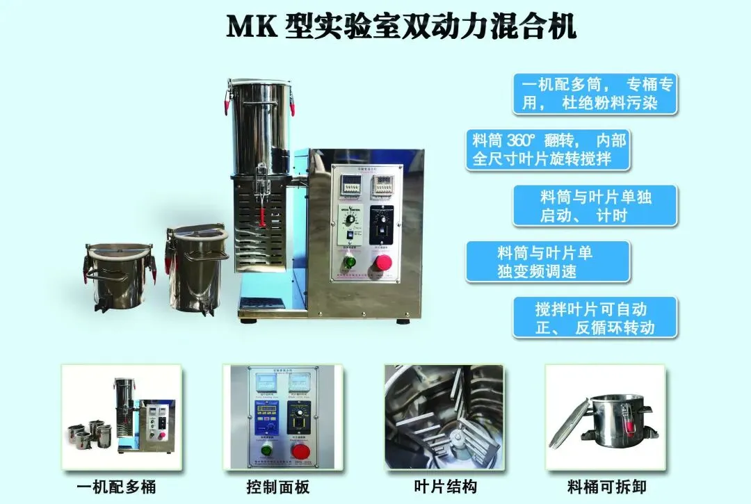 The laboratory dual-power mixer is specially developed and designed for colleges and universities, research institutions and enterprise laboratories. The equipment is compact and easy to use. Mixing principle: The 360° movement of the material bucket and the rotation of the internal stirring blades ensure that there are no dead corners during the mixing process. The internal blades force shearing to accelerate the flow and diffusion of the materials, allowing them to be thoroughly and evenly mixed to meet different experimental requirements. According to the size of the mixing volume, 1-20L material drums can be selected.