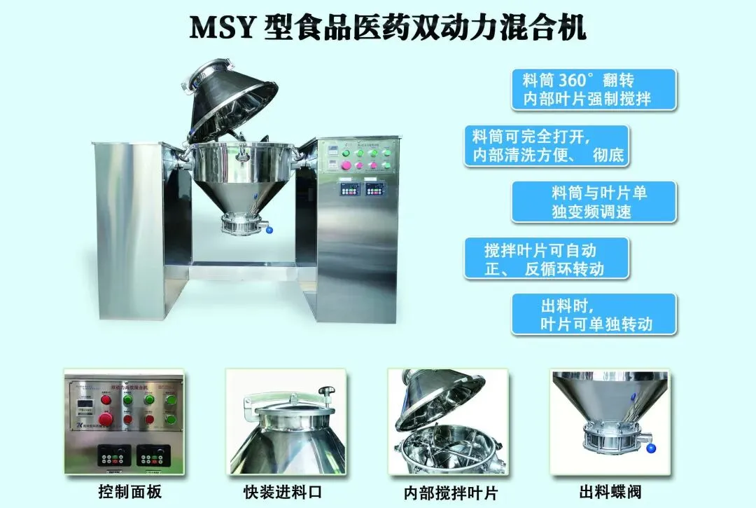 食品医药双动力混合机料桶可完全打开,叶片可拆卸,清洗方便、彻底,料桶360°转动叠加内部全尺寸搅拌叶片强制搅拌两种运动形式,使物料在料桶内无死角快速均匀混合。