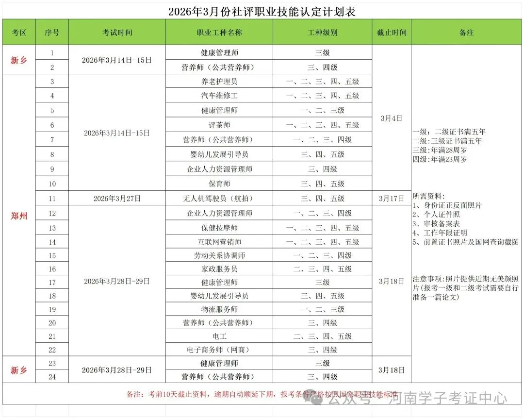 郑州/洛阳等地 2026年3月国家职业技能等级考试报考通知