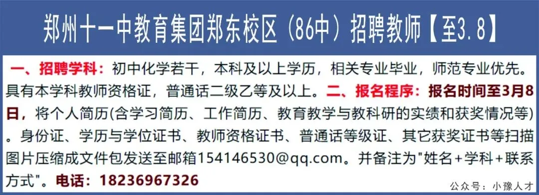 >郑州十一中教育集团郑东校区(86中)招聘教师【至3.8】
