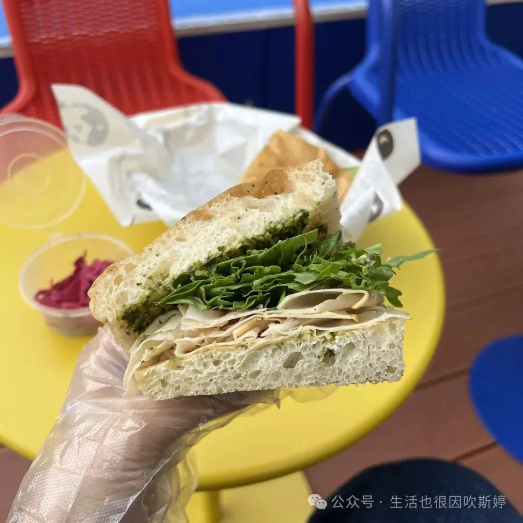 ①上次假期回来,偶然发现的可爱冷食店,吃到了最近半年最有记忆点的三明治,手作感很强,罗勒酱和佛卡夏面包是自己做的,放很多芝麻菜,还有自己腌的酸菜。即使在吃了午餐的下午,我一个人坐在路边也吃完了一整个的罗勒三明治。