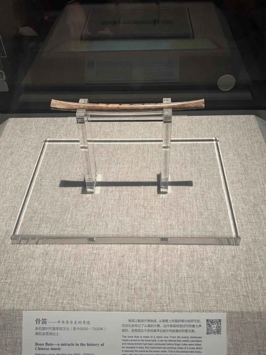 1、贾湖骨笛(一楼1号展厅),用丹顶鹤的尺骨做成的七孔骨笛,距今已有8000多年历史,能吹七声音阶,是真正的中华第一笛。
