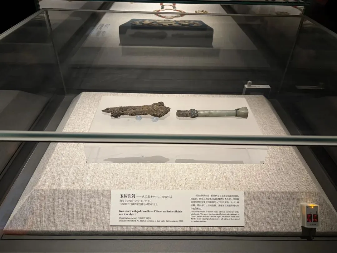 4、玉柄铁剑(一楼3展厅),由铁质剑身、铜质剑格、玉质剑柄组成,是中国最早的人工冶铁制品,被誉为“中华第一剑”。