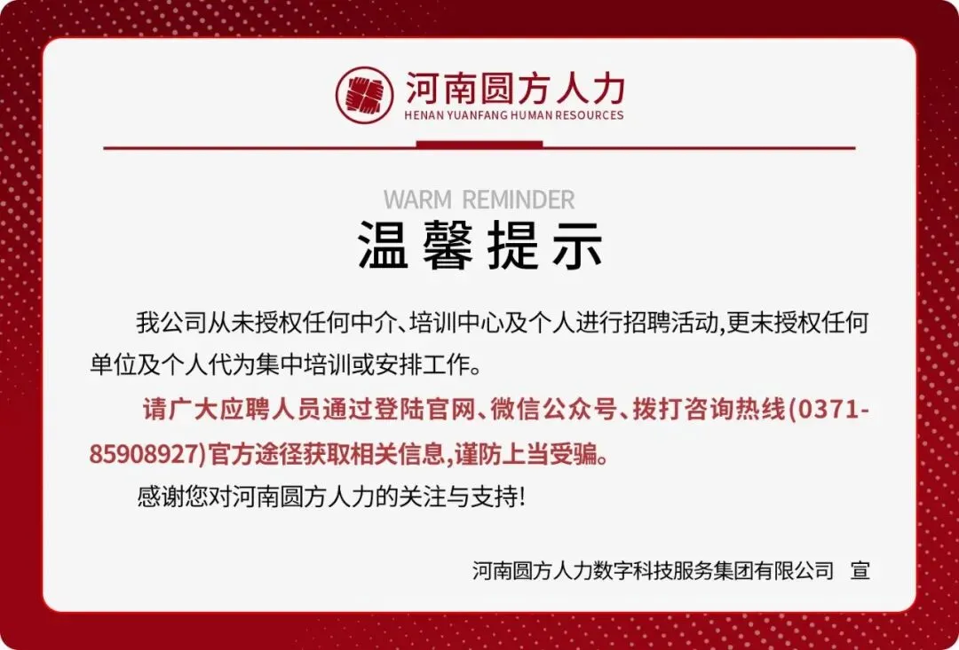 河南圆方人力(YFRLZY)——每日推送优质岗位。点击标题下方蓝字关注我们,让您的职业规划有更多选择。
