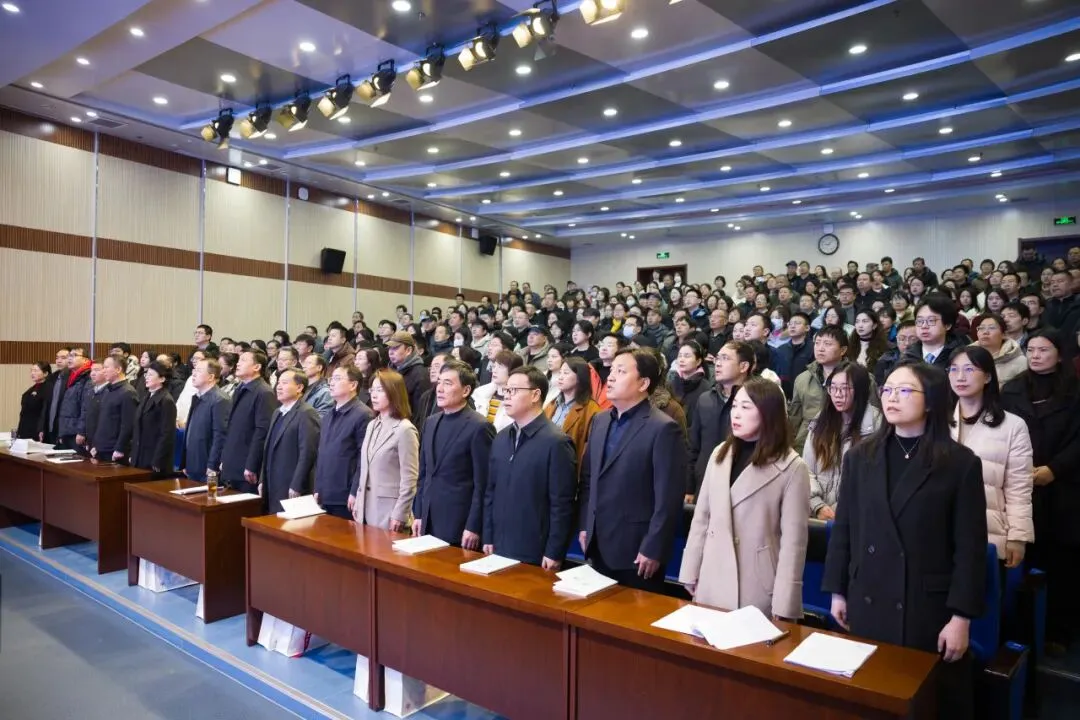 会议在雄壮的国歌声中拉开帷幕。全体教职工肃立注目,高唱国歌,以赤诚之心开启新学期奋进征程。