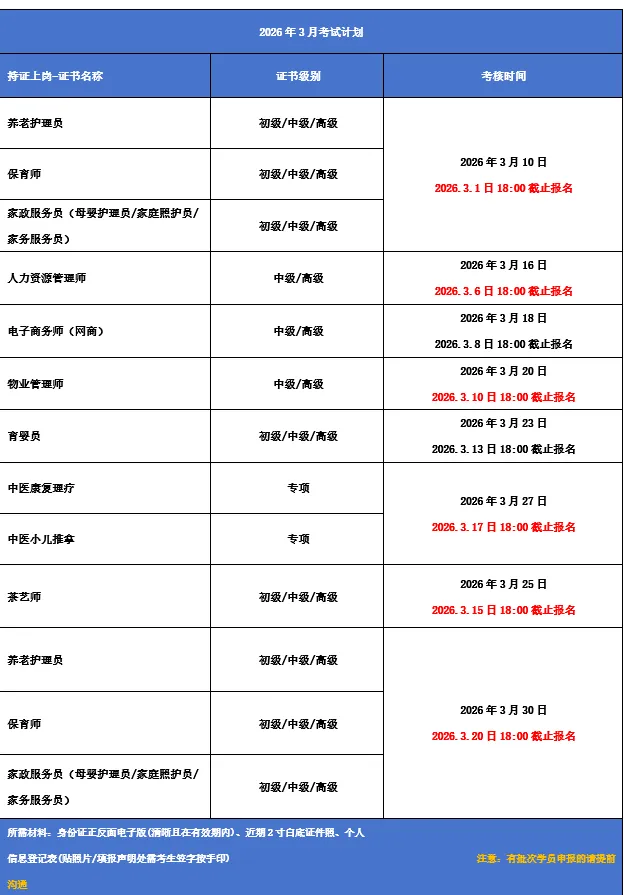 考试时间安排:2026年3月5日,3月12日,3月19日,3月26日