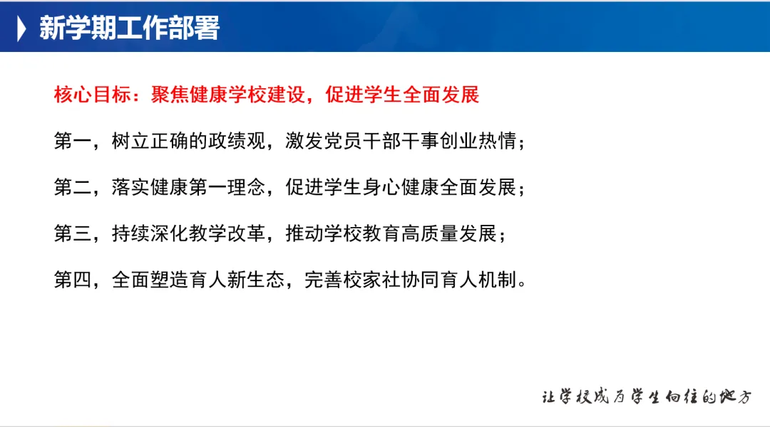 结合政策要求与学校实际,李校长围绕“聚焦健康学校建设,促进学生全面发展”这一核心目标,部署了四项重点工作: