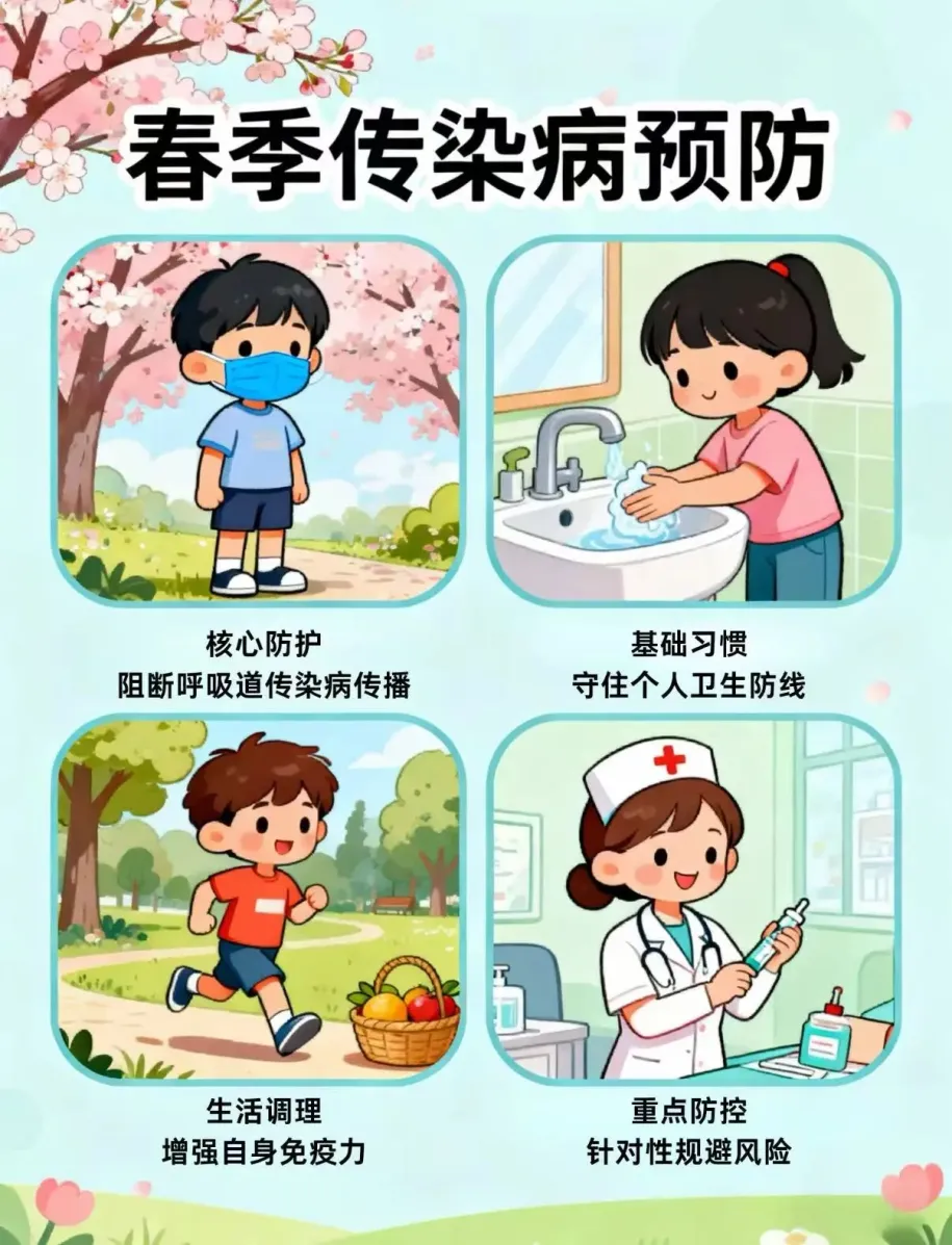 春季气温回升、气候多变,流感、水痘、手足口病等传染病进入高发期,加之校园人员密集,需重点防范: