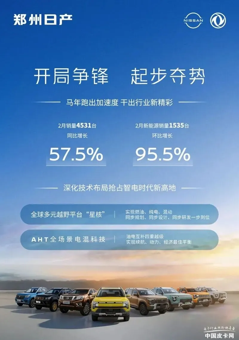 近日,郑州日产发布消息称,2月销量4531台,同比增长57.5%。2月新能源销量为1535台,环比增长95.5%。在这其中,新能源销量主要依靠Z9 GE PHEV以及FrontierPro PHEV支撑,足以证明用户对于新能源皮卡的接受度越来越高。