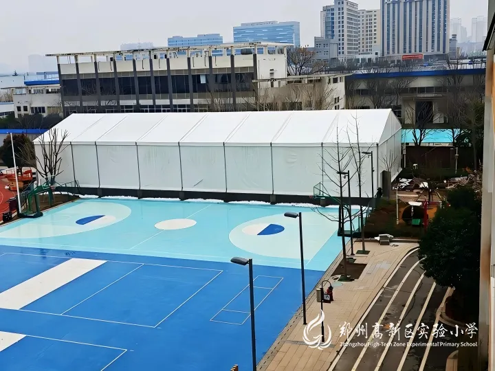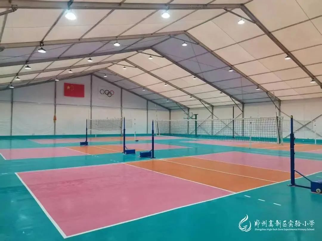 操场新建了铝合金装配式篷房体育馆,内部面积达550平方米,包含一块标准室内排球场和一块训练场。地面铺设8.5mm厚专业PVC运动地板,搭配防眩晕LED体育专用灯和专业训练器材,还配备了大功率空调。场馆可同时容纳70人进行训练,真正实现全年全天候全气候开放,风雨无阻等你来扣杀!