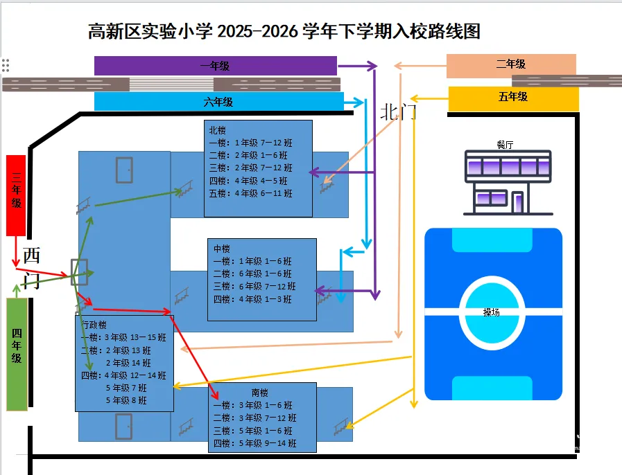 各年级的入学路线与上学期一致,如下图所示。