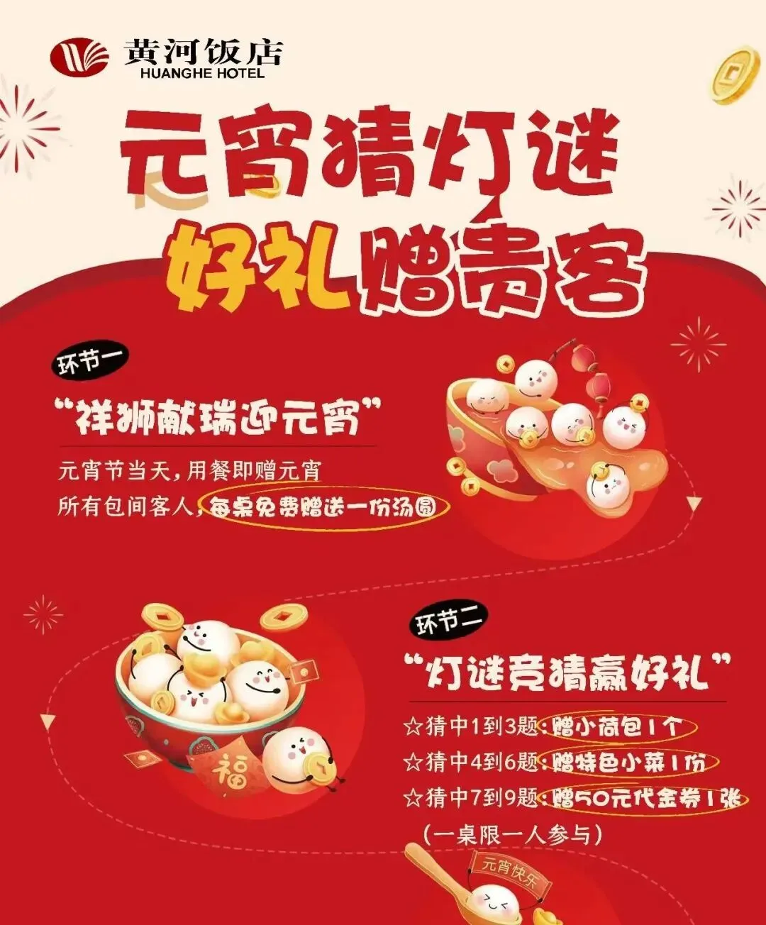 元宵当天黄河饭店双店送福,中餐厅用餐赠元宵、猜灯谜赢荷包/小菜/代金券;香天下火锅店消费满额赠套圈,套中赢蔬菜拼盘券、冻饺子券及火锅底料+代金券大奖,品美食玩游戏,欢乐过元宵~