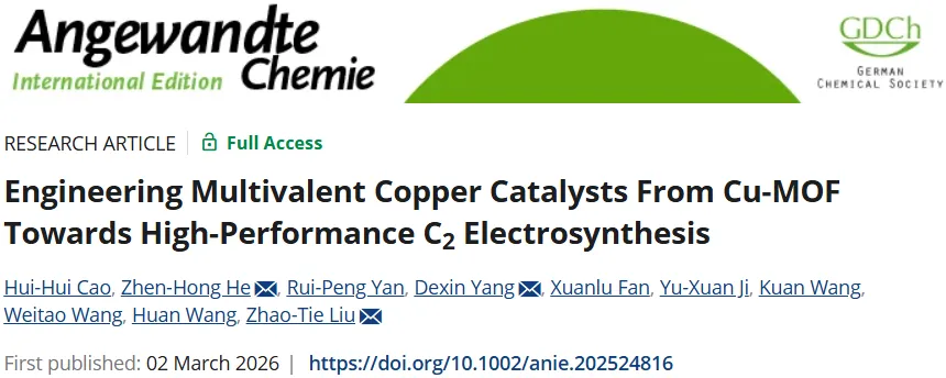 2026年03月02日,陕西科技大学刘昭铁、何珍红团队在Angewandte Chemie International Edition期刊发表题为“Engineering Multivalent Copper Catalysts From Cu-MOF Towards High-Performance C2 Electrosynthesis”的研究论文,团队成员曹会会为论文第一作者,刘昭铁、郑州大学杨得鑫、何珍红为论文共同通讯作者。