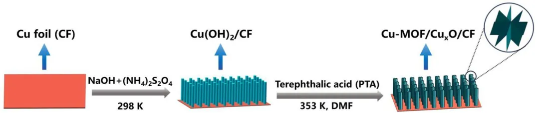 示意图1 Cu-MOF/CuₓO/CF-t电极的合成步骤。