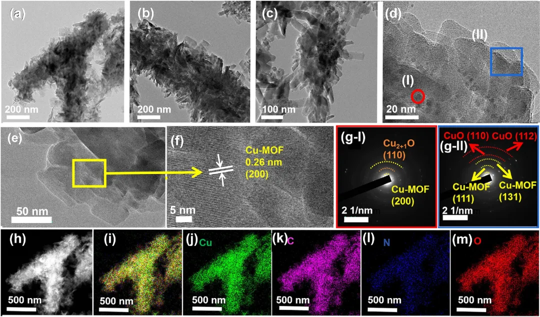 图1 Cu-MOF/CuₓO/CF-40的 (a–c) TEM图像,(d) SAED测试区域(I, II),(e, f) 高分辨率TEM (HRTEM) 图像,(g) SAED图谱,(h) HAADF图像,以及 (i–m) 元素分布图。