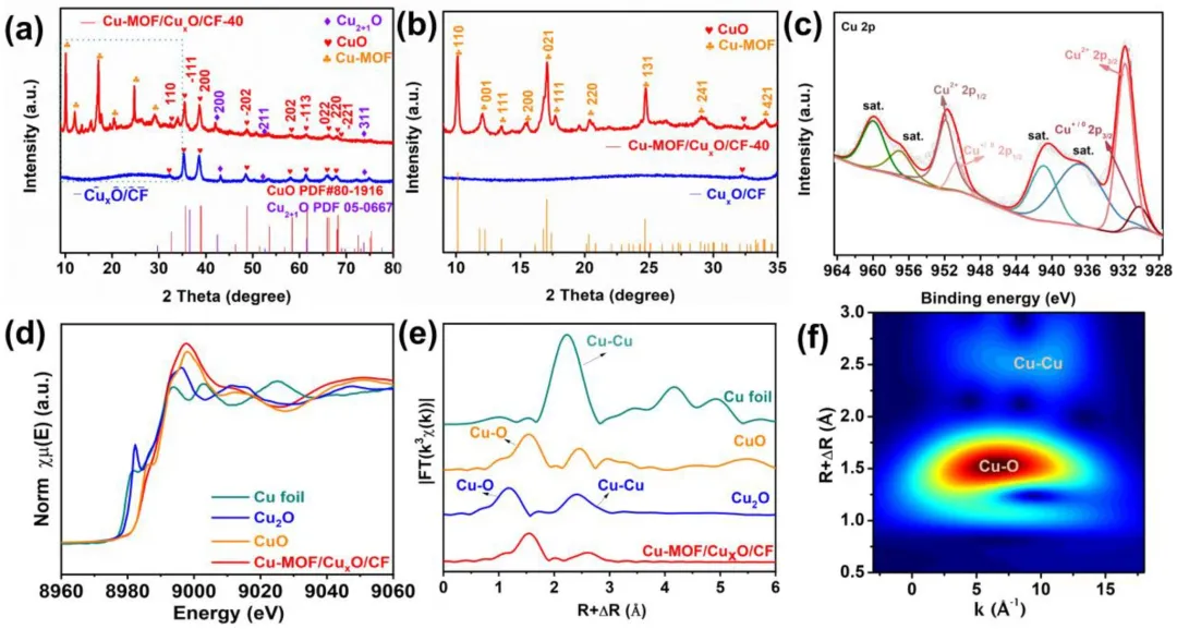 图2 (a) Cu-MOF/CuₓO/CF-40的XRD图谱及对应的参考PDF卡片。(b) 图 (a) 中5–35°范围内的放大XRD图谱。(c) Cu-MOF/CuₓO/CF-40的Cu 2p XPS能谱。(d) Cu箔、Cu₂O、CuO和Cu-MOF/CuₓO/CF-40的Cu K-edge XANES图谱。(e) Cu箔、Cu₂O、CuO和Cu-MOF/CuₓO/CF-40的傅里叶变换k³权重χ(k) EXAFS图谱。(f) Cu-MOF/CuₓO/CF-40的Cu K-edge EXAFS数据的小波变换。