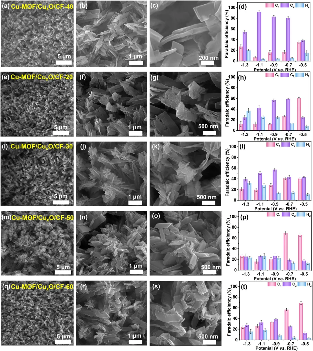 图3 通过碱性溶液浸泡 (a–c) 40、(e–g) 20、(i–k) 30、(m–o) 50 和 (q–s) 60 min合成的Cu-MOF/CuₓO/CF的SEM图像。在CO₂饱和的0.1 M KCl电解液中,通过碱性溶液浸泡40 (d)、20 (h)、30 (l)、50 (p) 和 60 (t) min合成的Cu-MOF/CuₓO/CF-t催化剂在不同外加电位下的ECO₂RR催化性能。误差棒表示三次独立实验的平均值±标准偏差。