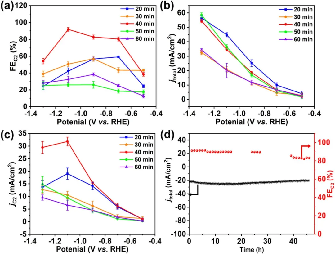 图4 不同浸泡时间(t = 20、30、40、50 和 60 min)制备的Cu-MOF/CuₓO/CF-t的 (a) C₂产物总FE,(b) 总电流密度,(c) C₂产物分电流密度(分电流密度均归一化至CF的几何表面积),以及 (d) Cu-MOF/CuₓO/CF-40催化剂在CO₂饱和0.1 M KCl电解液中于-1.1 V (vs. RHE) 下的稳定性。误差棒表示三次独立实验的平均值±标准偏差。