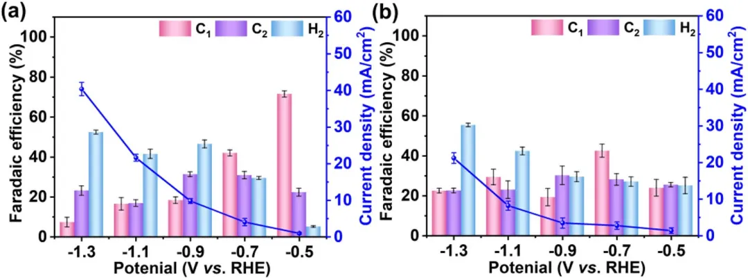 图5 (a) CuₓO/CF和 (b) CF样品在CO₂饱和的0.1 M KCl电解液中,不同电位下的ECO₂RR催化性能。误差棒表示三次独立实验的平均值±标准偏差。